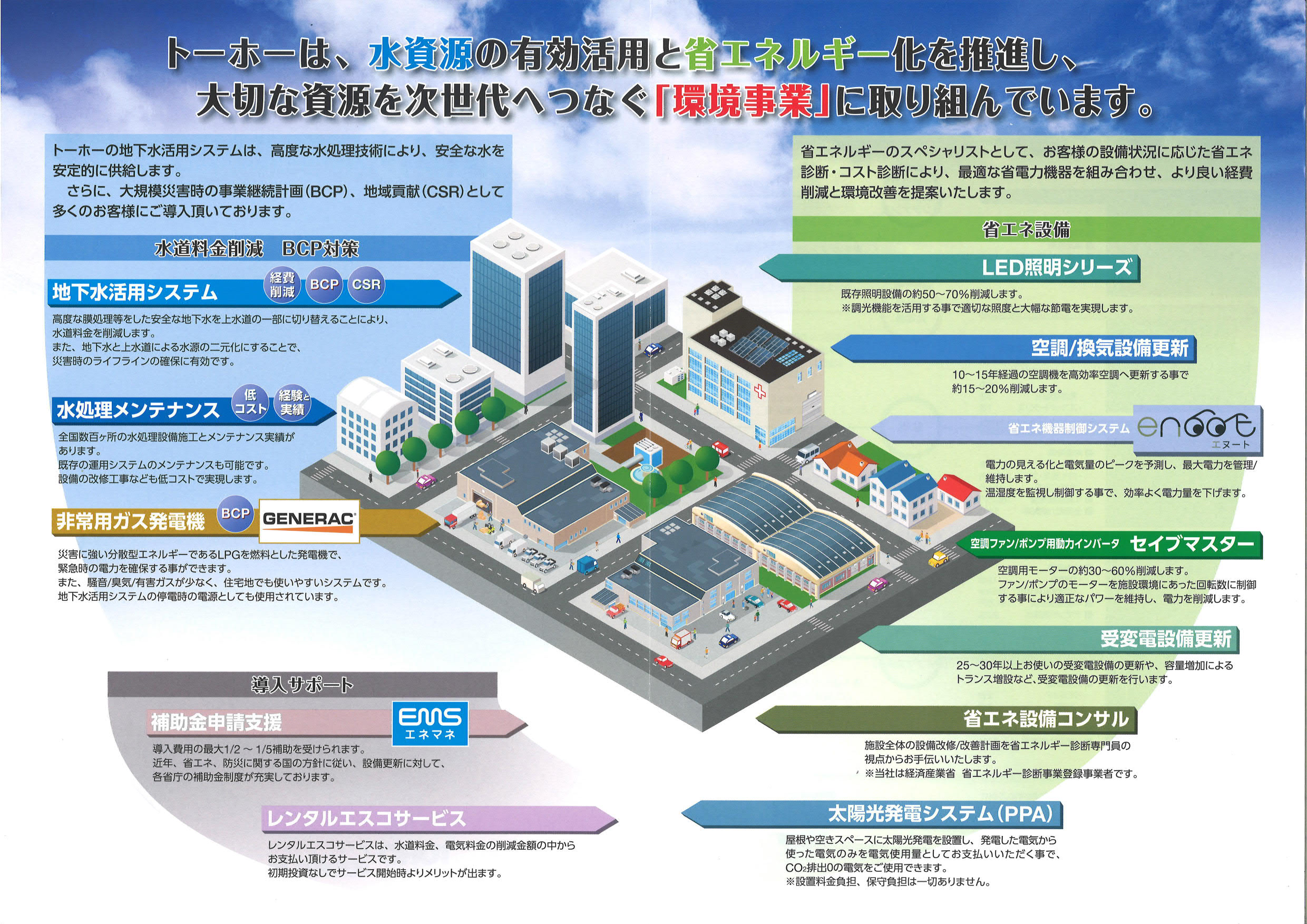 より良い環境を未来へ届けるために限りある資源を有効に活用いたします。トーホーが提供する「地下水活用システム」と「省エネBCP対策」は、まさに当社の両輪をなす事業です。お客様のニーズにお応え出来る様、会社一丸となって日々精進し、挑戦を続けて参ります。